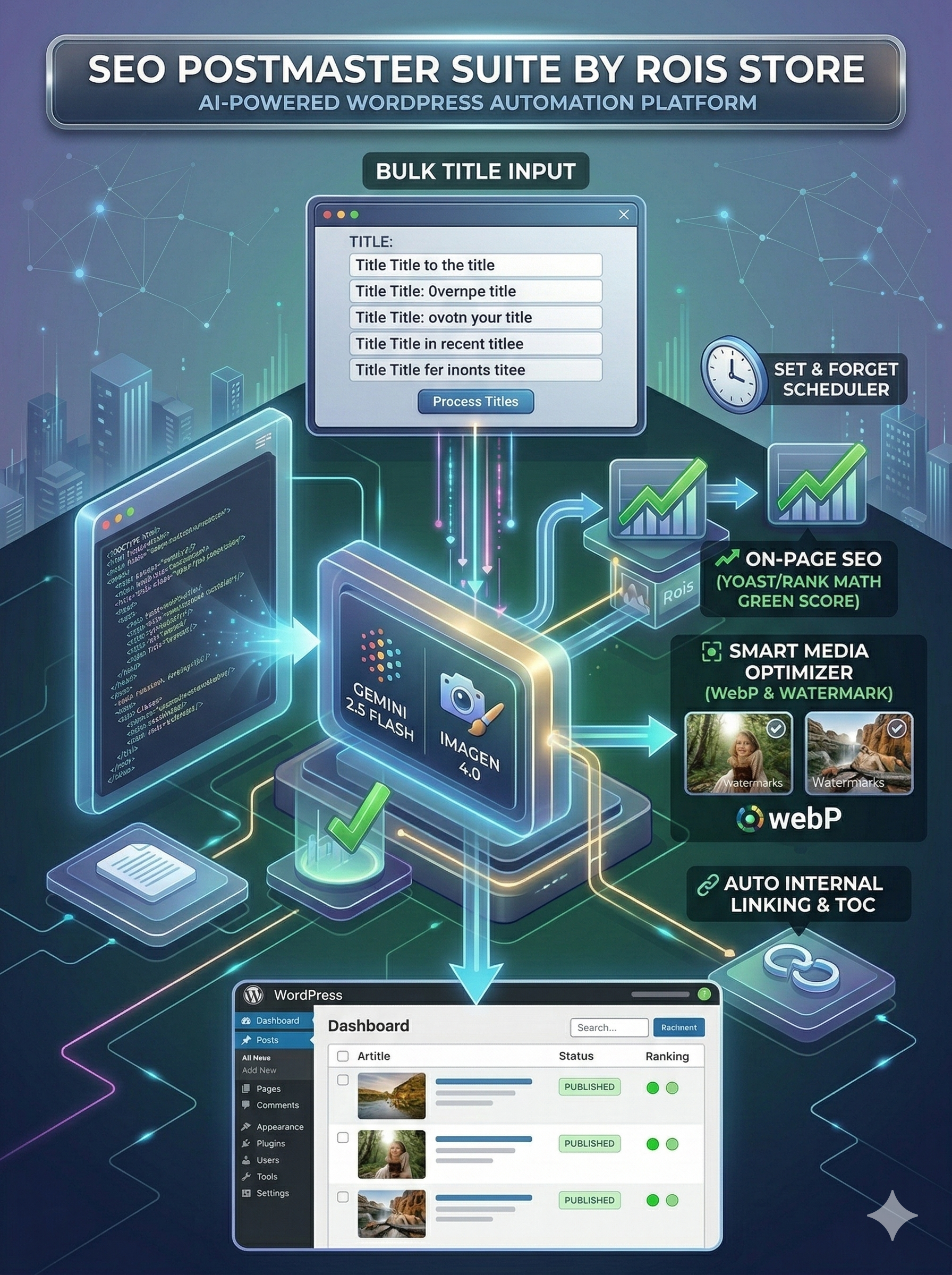 Integrated Dual-AI Architecture: As part of your monthly access, the suite utilizes the high-speed processing of the Gemini 2.5 Flash model for coherent, context-rich article generation, paired seamlessly with Imagen 4.0 to synthesize unique, photorealistic featured media for every post.